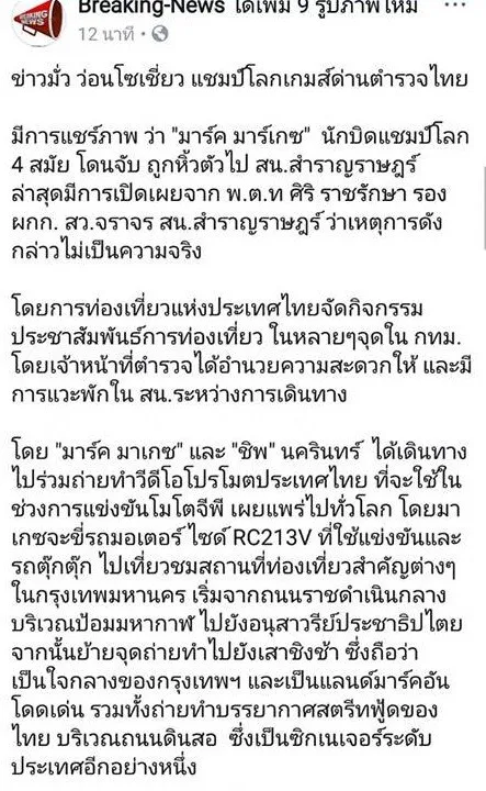 ต่อมาเฟซบุ๊กเพจ ได้ออกมาให้ข้อมูลเพิ่มเติมระบุว่า ข่าวดังกล่าวไม่เป็นความจริง โดยโพสท์ระบุว่า ข่าวมั่ว ว่อนโซเชี่ยว แชมป์โลกเกมส์ด่านตำรวจไทยมีการแชร์ภาพ ว่า "มาร์ค มาร์เกซ" นักบิดแชมป์โลก 4 สมัย โดนจับ ถูกหิ้วตัวไป สน.สำราญราษฎร์