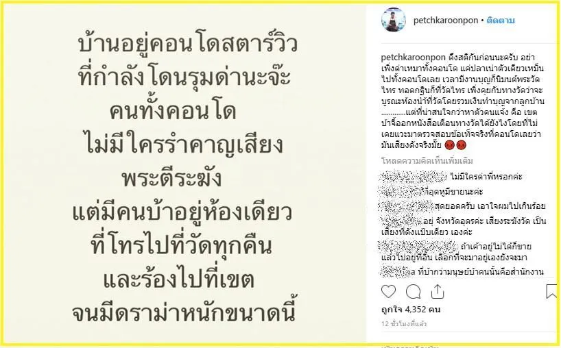 “ความเห็นส่วนตัว วัดมาอยู่ก่อนคน เราก็ต้องเข้าใจกิจวัตรของสงฆ์ เมื่อคุณเลือกที่จะมาอยู่ใกล้วัด คุณต้องรู้ว่ากิจวัตรของพระด้วย คือมีทำวัตรเช้า กับทำวัตรเย็น ซึ่งระยะเวลาที่พระท่านตีระฆังมันก็ดังไม่เกิน 2 นาที อีกอย่างเราก็ต้องตื่นกันแต่เช้าเพื่อไปทำงานกันอยู่แล้ว สิ่งแรกผมว่าเราต้องแก้ไขที่ตัวเองก่อน เมื่อรู้ว่าไม่ชอบเสียงดังคุณก็ติดกระจก หรืออะไรที่มันช่วยกันเสียง อีกอย่างร่างกายคนเรามันปรับสภาพได้ ช่วงแรกที่ได้ยินอาจจะนอนไม่หลับ แต่สักพักมันก็ชินไปเอง คือจะให้ย้ายวัดก็คงไม่ใช่”