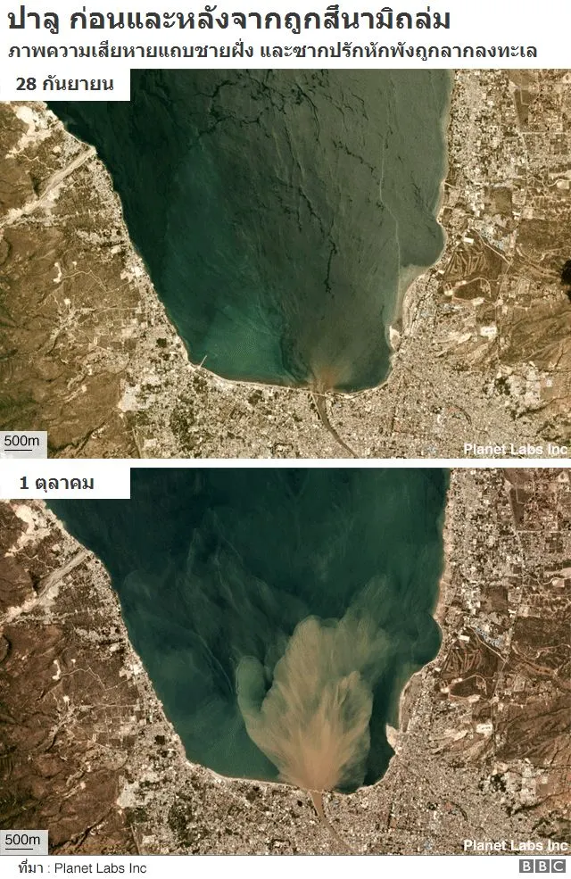 ปาลู ซึ่งเป็นเมืองที่ตั้งอยู่บริเวณอ่าวแคบ ๆ บนเกาะสุลาเวสี ถูกคลื่นยักษ์พัดถล่มใส่ ซึ่งคลื่นบางลูกมีความสูงถึง 6 เมตร ส่งผลให้อาคารบ้านเรือน และสิ่งปลูกสร้างต่าง ๆ ที่อยู่ในแถบนั้นถูกคลื่นซัดกระหน่ำจนพังราบเป็นหน้ากลอง