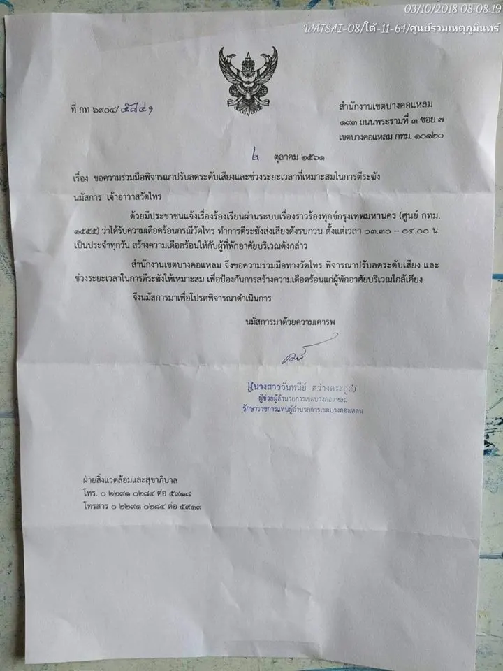 4 ต.ค. 2561 จากกรณีได้เกิดประเด็นร้อนเรื่องผู้อยู่อาศัยในคอนโดมิเนียมหรูย่านพระราม3 ได้ร้องเรียนไปยังสำนักงานเขตบางคอแหลม ว่า "วัดไทร" วัดเก่าแก่อายุหลายร้อยปีได้เคาะระฆังเสียงดัง ทำให้ผู้อยู่อาศัยคอนโดมิเนียมดังกล่าวเดือดร้อน