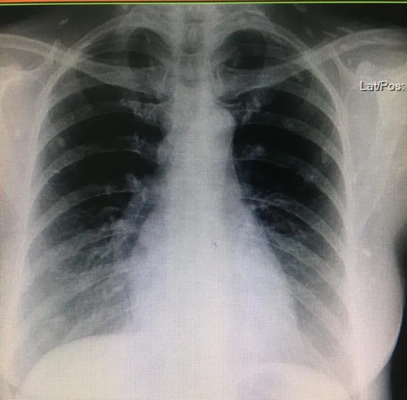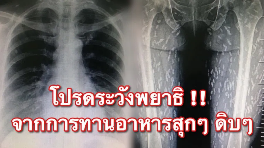 จากภาพทางด้านล่างคือ x–ray ตรงขา สะโพก แล้วที่ขาวๆ ที่กระจายทั่วกล้ามเนื้อ คือตัวอ่อนพยาธิตืดหมูที่ไชเข้าสู่ร่างกายแล้วระบบภูมิคุ้มกันของร่างกายก็รับมือกับมัน จนเกิดหินปูนมาเกาะ เคยเห็นแต่ในตำรา หมอเจ้าของโพสต์ได้เจอของจริงจะๆเลย