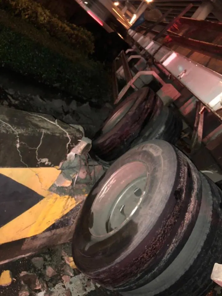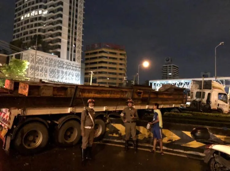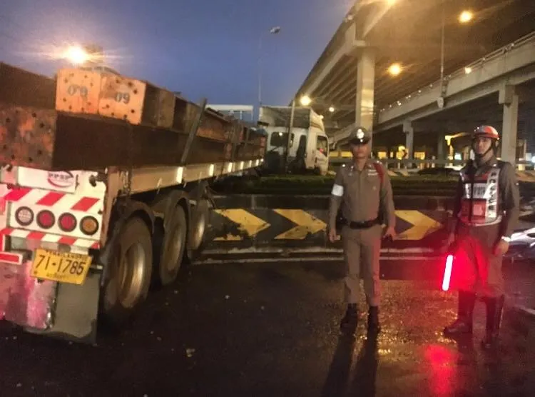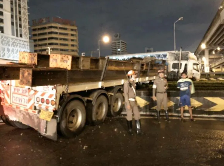 รถพ่วงบรรทุกเสาเหล็ก ปีนฟุตบาธ
