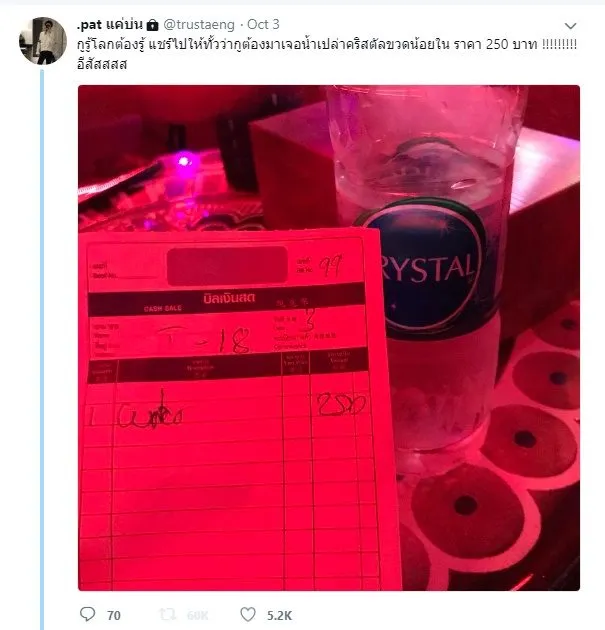 โดยโพสต์ดังกล่าวระบุว่า “กูรู้โลกต้องรู้ แชร์ไปให้ทั้วว่ากูต้องมาเจอน้ำเปล่าคริสตัลขวดน้อยใน ราคา 250 บาท !!!!!!!!! อีXXXX” ก่อนที่จะทวิตเพิ่มเติมว่า “เสริมนิดนึง พอเรื่องราคาน้ำ เหมือนอีผจก.ส่งพนักงานมายืนล้อมนี่ไว้ และแบบส่งคนมายืนส่องโทรศัพท์นี่อะ ว่านี่ลงอะไรทำอะไร ส่งคนมายืนเXอกนี่คุยกับเพื่อน และแม่งก็มองหน้านี่แบบ พร้อมตบมากจ้าและจะไปเข้าน้ำยังแบบไม่กล้าลุกเลย