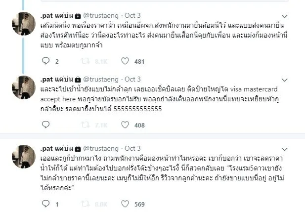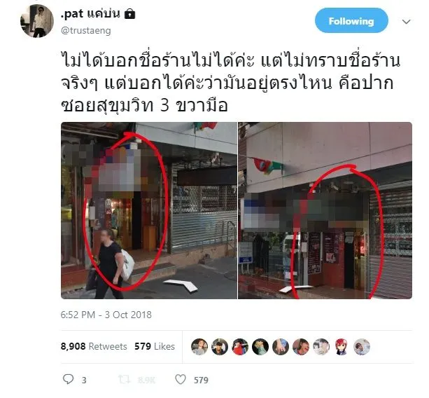เป็นเรื่องที่ได้รับการแชร์จากสมาชิกทวิตเตอร์ @trustaeng ซึ่งได้โพสต์เหตุการณ์ที่เกิดขึ้นกับตนเอง หลังจากใช้บริการในร้านอาหาร ซึ่งระบุว่า เป็นร้านประเภทกินดื่มแห่งหนึ่ง ในย่านสุขุมวิท โดยระบุว่า เป็นร้านที่อยู่ชั้น 5 ริมถนนสุขุมวิท 3