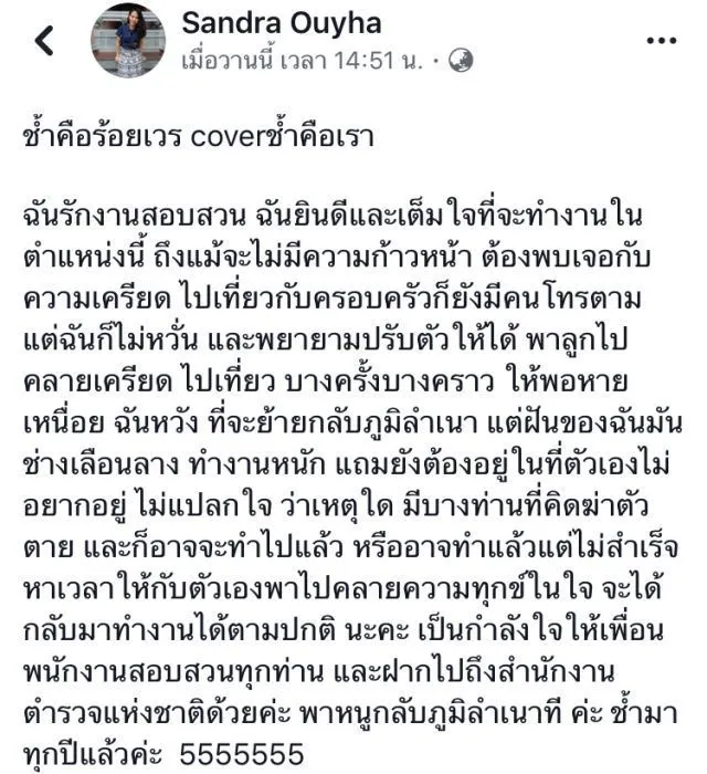 ตำรวจหญิงสุดอัดอั้นใจ ขอร้องเพลงระบายอารมณ์ ว่าตำรวจนั้นต้องเจออะไร โดยคัพเวอร์เพลง ระบายความในใจผ่านสื่อโซเชียล นี่คือชื่อเพลงที่เขาคิดของเธอ ช้ำคือร้อยเวร coverช้ำคือเรา เเละนี้คือข้อความของเขา ฉันรักงานสอบสวน ฉันยินดีและเต็มใจที่จะทำงานในตำแหน่งนี้ ถึงแม้จะไม่มีความก้าวหน้า ต้องพบเจอกับความเครียด ไปเที่ยวกับครอบครัวก็ยังมีคนโทรตาม แต่ฉันก็ไม่หวั่น และพยายามปรับตัวให้ได้ พาลูกไปคลายเครียด ไปเที่ยว บางครั้งบางคราว ให้พอหายเหนื่อย ฉันหวัง ที่จะย้ายกลับภูมิลำเนา แต่ฝันของฉันมันช่างเลือนลาง ทำงานหนัก แถมยังต้องอยู่ในที่ตัวเองไม่อยากอยู่ ไม่แปลกใจ ว่าเหตุใด มีบางท่านที่คิดฆ่าตัวตาย และก็อาจจะทำไปแล้ว หรืออาจทำแล้วแต่ไม่สำเร็จ หาเวลาให้กับตัวเองพาไปคลายความทุกข์ในใจ จะได้กลับมาทำงานได้ตามปกติ นะคะ เป็นกำลังใจให้เพื่อนพนักงานสอบสวนทุกท่าน และฝากไปถึงสำนักงานตำรวจแห่งชาติด้วยค่ะ พาหนูกลับภูมิลำเนาที ค่ะ ช้ำมาทุกปีแล้วค่ะ 5555555 ว่าเเล้วเราก็ไปชมคลิปกันเลย
