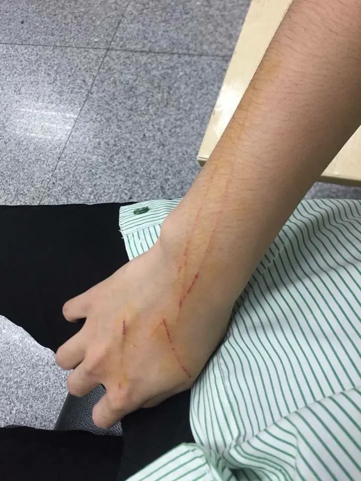 ผู้ใช้เฟสบุ๊กชื่อ เปมิกา ด้วงทอง ได้โพสต์ภาพตนเองซึ่งได้รับบาดเจ็บที่บริเวณหน้า และแขนทั้ง 2 ข้าง หลังโดนวัยรุ่นที่มีอาการเมาสุราได้ตวัดมีดขู่เอาเงินระหว่างเดินไปทำงาน พร้อมระบุข้อความว่า