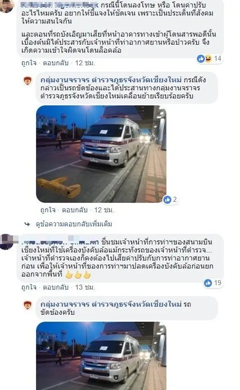อย่างไรก็ตาม ต่อมาเฟซบุ๊กแฟนเพจของกลุ่มงานจราจร ตำรวจภูธรจังหวัดเชียงใหม่ ได้โพสท์ความคืบหน้าและชี้แจงภาพดังกล่าวว่า รถตู้ของตำรวจนั้นนั้นเกิดขัดข้อง และได้นำรถมาลากออกจากพื้นที่แล้ว โดยระบุว่า “ประเด็นโลกโซเชี่ยล” เป็นกรณีรถของหน่วยงานราชการจอดบริเวณท่าอากาศยานเชียงใหม่ เป็นรถที่ขัดข้องและได้ประสานรถยกของกลุ่มงานจราจรตำรวจภูธรจังหวัดเชียงใหม่ดำเนินการเคลื่อนย้ายเรียบร้อยครับ