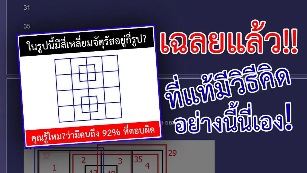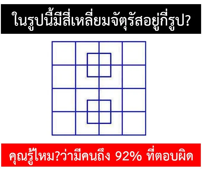 นี่เป็นโจทย์ปัญหาหรือควิซที่มีการถามและแชร์กันเยอะมาาาาาาาาก ให้หาว่ามีจำนวนสี่เหลี่ยมจัตุรัสอยู่กี่รูป แต่ละคนก็ตอบไปต่างๆนาๆ มีตั้งแต่ที่นับได้ 10 กว่า 20 , 30 หรือบางคนบอกว่า 116 , 118 ก็มี โดยในที่สุดก็มีคลิปเฉลยในยูทูบว่ามีวิธีคิดอย่างไร ไปชมกันเลยค่ะ