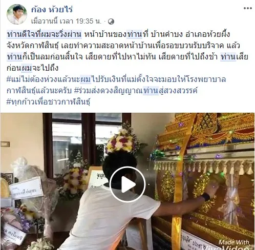 "ท่านดีใจที่ผมจะวิ่งผ่าน หน้าบ้านของท่านที่ บ้านคำบง อำเภอห้วยผึ้ง จังหวัดกาฬสินธุ์ เลยทำความสะอาดหน้าบ้านเพื่อรอขบวนรับบริจาค แล้วท่านก็เป็นลมก่อนสิ้นใจ เสียดายที่ไปหาไม่ทัน เสียดายที่ไปถึงช้า ท่านเสียก่อนผมจะไปถึง #แม่ไม่ต้องห่วงแล้วนะผมไปรับเงินที่แม่ตั้งใจจะมอบให้โรงพยาบาลกาฬสินธุ์แล้วนะครับ #ร่วมส่งดวงสิญญาณท่านสู่สวงสวรรค์ #จะทำแบบนี้จนกว่าจะหมดลมหายใจ #ทุกก้าวเพื่อชาวกาฬสินธุ์"
