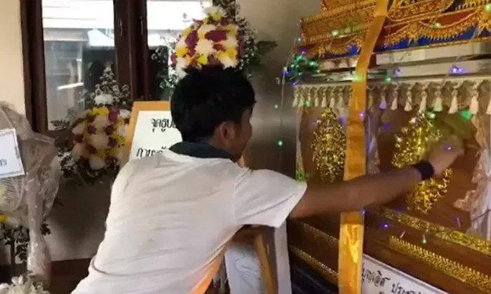 นักร้องหนุ่มได้เคาะโลงศพบอกกล่าวกับนางบุญเลิศ พร้อมรับเงินบริจาคจากครอบครัวเพื่อไปสมทบทุนกับโรงพยาบาลกาฬสินธุ์ ตามเจตนารมณ์สุดท้ายของผู้วายชนม์ บรรยากาศเต็มไปด้วยความโศกเศร้า