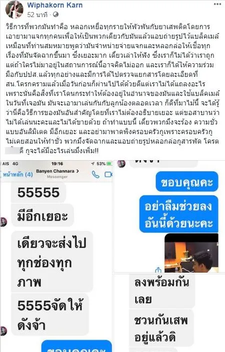 สำหรับ “กานต์ วิภากร” คลิปเสียงทวงเงินเสี่ยโป้พร้อมกับโพสต์ข้อความที่แคปชั่นยาวๆว่า วิธีการที่พวกมันทำคือ หลอกเหยื่อทุกรายให้พัวพันกับยาเสพติดโดยการเอายามาแจกทุกคนเพื่อให้เป็นพวกเดียวกับมันแล้วแอบถ่ายรูปไว้แบล็คเมล์เหมือนที่ท่านสมหมายพูดว่ามันจำหน่ายจ่ายแจกและหลอกล่อให้เชื่อทุกเรื่องที่มันจัดฉากขึ้นมา ซึ่งเยอะมาก เดี๋ยวเล่าให้ฟัง ซึ่งเราก็ไม่ได้ว่าเราถูกแต่ถ้าใครไม่มาอยู่ในสถานการณ์นี้อาจคิดไม่ออก