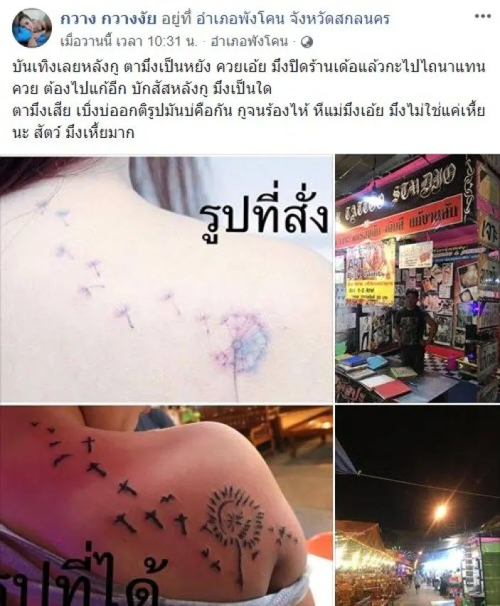 อย่างล่าสุดสาวผู้ใช้เฟสบุ๊กชื่อ “กวาง กวางงัย” ได้โพสต์ภาพรอยสักที่พึ่งไปสักมาก แทบจะร้องไห้ เพราะมันไม่เหมือนกับแบบที่สั่ง โดยเธอโพสต์ระบุข้อความไว้ว่า…