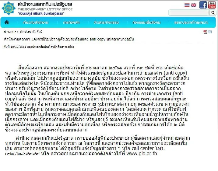 บนเว็บไซต์สำนักงานสลากกินแบ่งรัฐบาลชี้แจงกรณีไม่ปรากฎตัวเลขสะท้อนแสง anti copy บนสลากบางฉบับงวดวันที่ 16 ตุลาคม 2561 งวดที่ 39 ชุดที่ 52