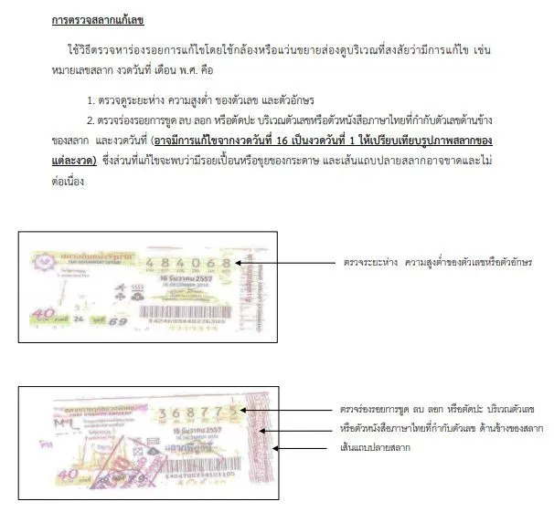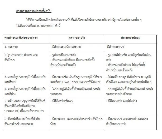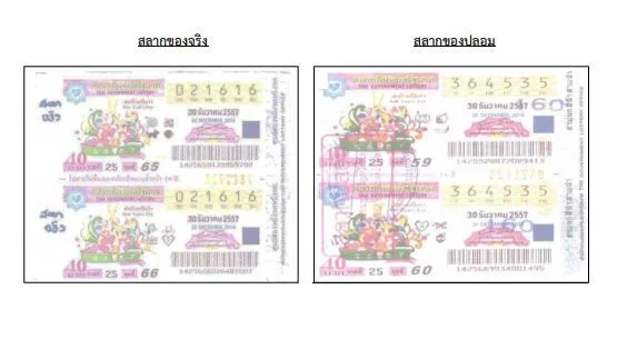 ทั้งนี้การตรวจสอบสลากว่าจริงหรือปลอมนั้นใช้วิธีการเปรียบเทียบโดยนำสลากฉบับที่แท้จริงของสำนักงานสลากกินแบ่งรัฐบาลในแต่ละงวดนั้น ๆไว้เป็นแบบเพื่อหาความแตกต่าง ดังนี้