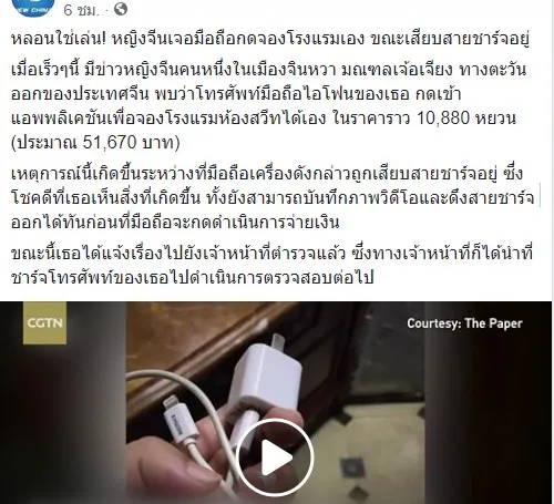 หญิงจีนตกใจ เจอมือถือกดจองโรงแรมเอง ห้องสวีทราคากว่า 5 หมื่น ขณะเสียบสายชาร์จอยู่ 10 ต.ค.61 เพจเฟซบุ๊ก แห่งหนึ่ง รายงานว่า
