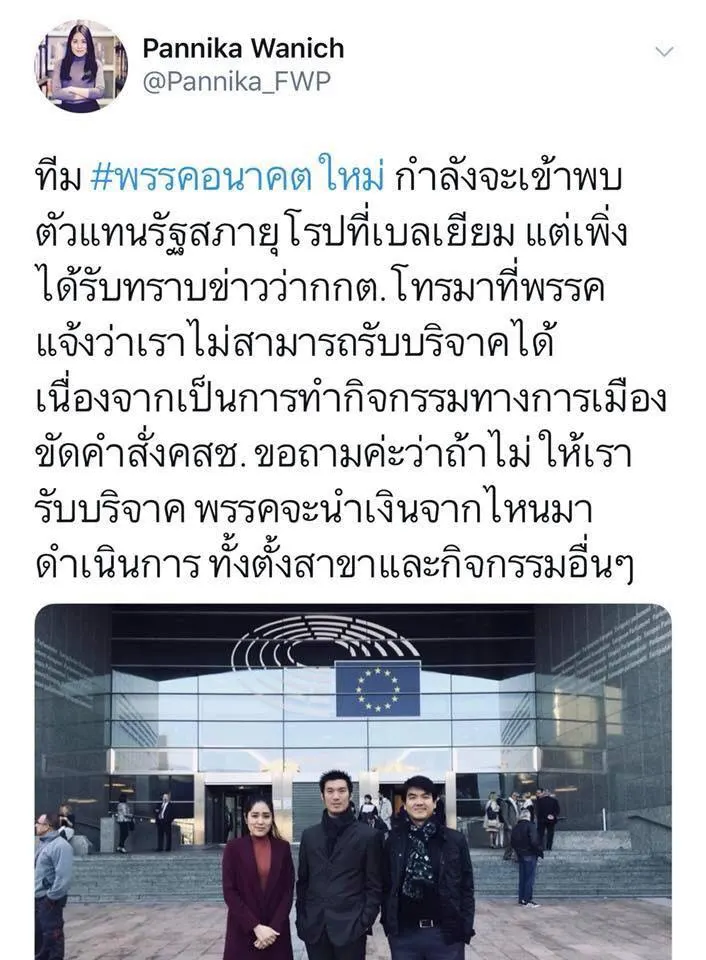ช่อ พรรณิการ์ โฆษกพรรคอนาคตใหม่ แจ้งสื่อมวลชนว่าทางพรรคเพิ่งได้รับโทรศัพท์จากกกต. ห้ามเรารับบริจาคเงิน เนื่องจากถือเป็นกิจกรรมทางการเมือง ขัดคำสั่งคสช.จะมีแถลงข่าวด่วนภายในเย็นนี้ โดยจะส่งคลิปให้สื่อเพราะตอนนี้อยู่ที่บรัสเซลส์กัน ไม่สามารถจัดแถลงข่าวที่พรรคได้