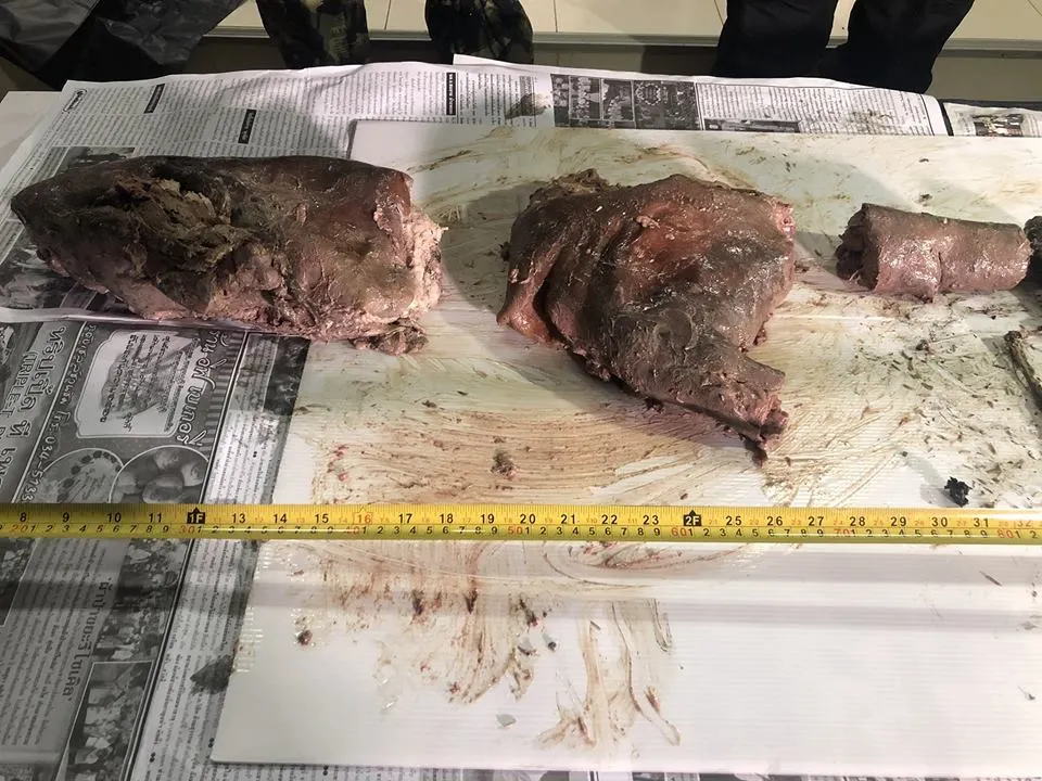 ๒) ซากสัตว์ป่า หมีขอ หรือ บินตุรง (Arctictis binturong) จำนวน ๓ ชิ้น น้ำหนัก ๔.๓ กม.