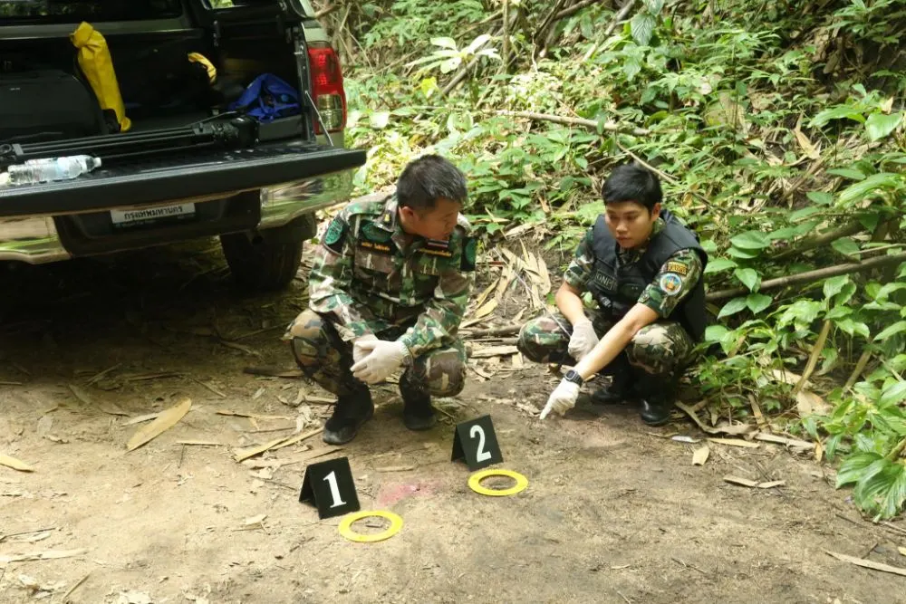 จุดที่ ๓ บริเวณที่ นายตาตา (ผู้ต้องหา) แจ้งว่าเป็นจุดยิงและล่าสัตว์ป่า (หมีขอ) บนต้นไทร ด้วยอาวุธปืนลูกกรด ห่างจากป้ายทางเข้าสำนักสงฆ์เต่าดำ ๓๐ เมตร และห่างจากจุดที่นายวัชรชัยและพวกตั้งแคมป์ ๓๐๐ เมตร พบปลอกกระสุนปืน ขนาด .๒๒ มิลลิเมตร จำนวน ๑ ปลอก