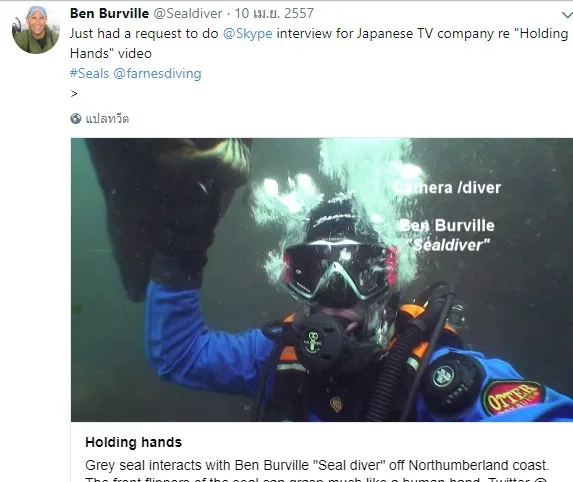แพทย์หนุ่มได้โพสต์คลิปน่ารักที่หาดูได้ยาก หลังแมวน้ำตัวหนึ่งเข้ามาเกาะติดไม่ยอมให้ตนว่ายไปไหน 9ต.ค.61 มีผู้ใช้ทวิตเตอร์ที่ชื่อ เบน เบอร์วิลล์ Ben Burville ได้โพสต์คลิปสุดน่ารักของตนกับเจ้าแมวน้ำ ซึ่งคลิปดังกล่าวถูกพูดถึงบนโลกออนไลน์อย่างมาก เนื่องจากอิริยาบถต่างๆ ของแมวน้ำที่เข้ามาเล่นกับคนนั้นไม่ค่อยจะได้เห็นกันง่ายๆ คลิปวิดีโอของเบนนั้นนับว่าเป็นการแสดงออกถึงมิตรภาพระหว่างคนกับสัตว์ได้อย่างน่ารัก