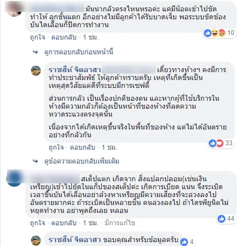 ต่อมา มีผู้เข้ามาแสดงความคิดเห็นว่า เหตุการณ์ดังกล่าว เรียกว่า สเต็ปแตก เกิดจาก สิ่งแปลกปลอม เช่น เหรียญ เข้าไปยัดในแก็ปของสเต็ป เกิดการเบียดแน่นจึงระเบิด พร้อมแนะนำว่า เวลาขึ้นบันไดเลื่อนอย่าล้วงหาเหรียญ