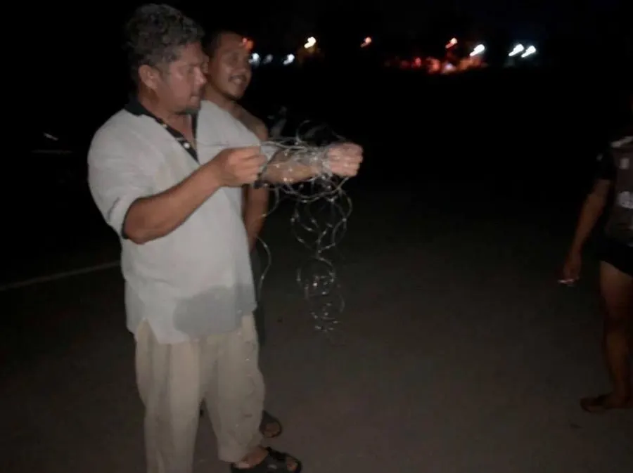 ที่เกิดเหตุ ชาวบ้านที่ผ่านมาพยได้ช่วยกันตัดเส้นเอ็นขนาดใหญ่ แบบที่ใช้ในงานก่อสร้าง ขึงพาดจากกำแพงรั้วสนามกีฬา ขวางถนนมาผูกปลายอีกข้างที่โคนต้นไม้ริมคลอง ซึ่งจากการสอบถาม นายพงศกร ยิ้มสะอาด 18 ปี อยู่บ้านเลขที่ 61 ม.4 ต.ยุ้งทะลาย ผู้มาพบแล้วโทรแจ้งตำรวจกล่าวว่าก่อนเกิดเหตุ ตนขี่รถ จยย. มกันา 3 คัน รวม 4 คน มาหาเพื่อนในหมู่บ้าน เมื่อมาถึงตนสังเกตุแสงไฟหน้ารถไปกระทบกับเส้นเอ็น ทำให้เกิดประกายแสง ตนจึงชะลอรถแล้วแจ้งเพื่อนๆให้จอดลงมาดูก็พบเส้นเอ็นขึงพาดถนน ยาวกว่า 20 เมตร จึงรีบตัดออกแบ้วแจ้งตำรวจให้มาตรวจสอบ ซึ่งพยกตนก็ไม่ทราบจุดประสงค์ของผู้ที่นำเอ็นมาขึง ว่าต้องการสิ่งใด ซึ่งคาดว่าถ้าไม่ประสงค์ต่อทรัพย์ ก็อาจไม่พอใจที่ช่วงกลางคืนอาจมีเด็กแว้นมาขี่รถเสียงดังสร้างความไม่พอใจให้ใครหรือเปล่า ซึ่งหากตนไม่พบเห็นเสียก่อนอาจมรผู้บริสุทธิ์ ขี่ผ่านมาประสบเหตุร้ายได้ จึงอยากให้เจ้าหน้าที่หมั่นคอยออกตรวจตราและหาคนที่กระทำการดังกล่าวมาสอบสวนต่อไป.