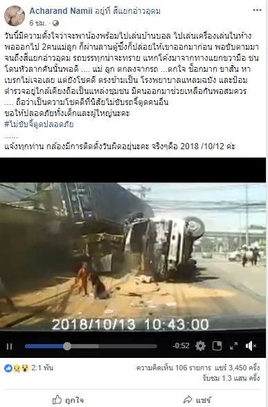 โดยผู้ใช้เฟซบุ๊ก Acharand Namii ได้ระบุข้อความเอาไว้ว่า "สิบล้อแหกโค้งชนรถบรรทุก สองแม่ลูกกระเด็นออกนอกกระจก..! วันนี้มีความตั้งใจว่าจะพาน้องพร้อมไปเล่นบ้านบอล ไปเล่นเครื่องเล่นในห้าง พอออกไป 2 คนแม่ลูก ก็ผ่านลานตู้ซึ่งก็ปล่อยให้เขาออกมาก่อน
