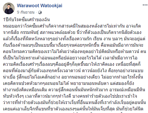 ล่าสุดได้มีผู้ใช้เฟซบุ๊กที่ชื่อว่า Warawoot Watookjai ได้เล่าเรื่องราวของตนเองที่ป่วยเป็นโรคซึมเศร้ามานานถึง 1 ปี ยอมรับและแก้ไขปัญหาด้วยการพบแพทย์ และรักษามาอย่างต่อเนื่อง แต่ก็มีบางครั้งที่เจอเรื่องราวต่างๆ มากระทบจิตใจและทำให้อาการกลับมาแย่อีก โดยเจ้าตัวเล่าว่า