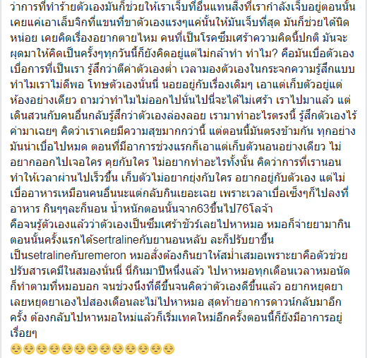 นอยอยู่กับเรื่องเดิมๆ เอาแต่เก็บตัวอยู่แต่ห้องอย่างเดียว ถามว่าทำไมไม่ออกไปนั่นไปนี่จะได้ไม่เศร้า เราไปมาแล้ว แต่เดินสวนกับคนอื่นกลับรู้สึกว่าตัวเองล่องลอย เรามาทำอะไรตรงนี้ รู้สึกตัวเองไร้ค่ามาเฉยๆ คิดว่าเราเคยมีความสุขมากกว่านี้ แต่ตอนนี้มันตรงข้ามกัน ทุกอย่างมันน่าเบื่อไปหมด ตอนที่มีอาการช่วงแรกก็เอาแต่เก็บตัวนอนอย่างเดียว ไม่อยากออกไปเจอใคร คุยกับใคร ไม่อยากทำอะไรทั้งนั้น คิดว่าการที่เรานอนทำให้เวลาผ่านไปเร็วขึ้น เก็บตัวไม่อยากยุ่งกับใคร อยากอยู่กับตัวเอง แต่ไม่เบื่ออาหารเหมือนคนอื่นนะแต่กลับกินเยอะเฉย เพราะเวลาเบื่อเซ็งๆก็ไปลงที่อาหาร กินๆ ละก็นอน น้ำหนักตอนนั้นจาก 63 ขึ้นไป 76 โลจ้า