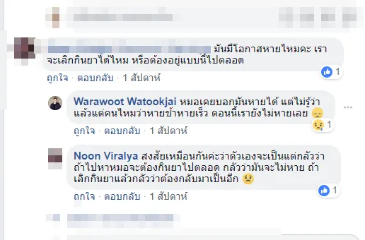 คือจนรู้ตัวเองแล้วว่าตัวเองเป็นซึมเศร้าชัวร์เลยไปหาหมอ หมอก็จ่ายยามากิน ตอนนั้นครั้งแรกได้ sertraline กับยานอนหลับ ละก็ปรับยาขึ้นเป็น setraline กับ remeron หมอสั่งต้องกินยาให้สม่ำเสมอเพราะยาคือตัวช่วยปรับสารเคมีในสมองนั่นนี่ นี่กินมาปีหนึ่งแล้ว ไปหาหมอทุกเดือนเวลาหมอนัด ก็ทำตามที่หมอบอก จนช่วงนึงที่ดีขึ้นจนคิดว่าตัวเองดีขึ้นแล้ว อยากหยุดยาเลยหยุดยาเองไปสองเดือนละไม่ไปหาหมอ สุดท้ายอาการดาวน์กลับมาอีกครั้ง ต้องกลับไปหาหมอใหม่แล้วก็เริ่มเทคใหม่อีกครั้งตอนนี้ก็ยังมีอาการอยู่เรื่อยๆ"