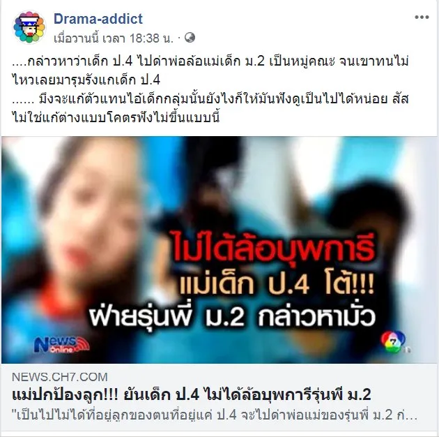 เพจ Drama-addict โพสต์ข่าว...กล่าวหาว่าเด็ก ป.4 ไปด่าพ่อล้อแม่เด็ก ม.2 เป็นหมู่คณะ จนเขาทนไม่ไหวเลยมารุมรังแกเด็ก ป.4