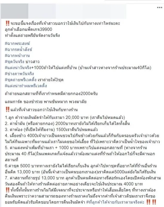ทางร้าน ระบุว่า ทางร้านและทีมงานต้องขออภัยลูกค้าที่ทางร้านทำงานไม่ได้ตามที่ลูกค้าตั้งใจ กับคอมเมนต์ที่ลูกค้าว่า “รูปใช้ไม่ได้เลยซักรูป (ถ่ายไป500กว่ารูป) มุมถ่ายก็ไม่ได้ ถ่ายแบบนี้ใครถ่ายก็ได้ ช่างภาพกะโหลกกะลา “ไอ้เ-ย”จะเอารูปไปโชว์ใครได้วะ” นี่คำพูดนี่คือลูกค้าพูดกับเราทั้งนี้ทั้งนั้นทางร้านและทีมงานจึง #ขออนุญาตคืนเงินเต็มจำนวนให้ลูกค้าทั้งหมดและต้องขออภัยจริงๆค่ะ ที่ต้องโพสต์เเบบนี้ เพื่อเเสดงความรับผิดชอบ เเละเพื่อป้องกันผู้ที่ไม่ทราบถึงข้อเท็จจริงในเหตุการณ์ที่เกิดขึ้นนำไปพูดต่อในทางที่เสียหายจะได้ไม่
