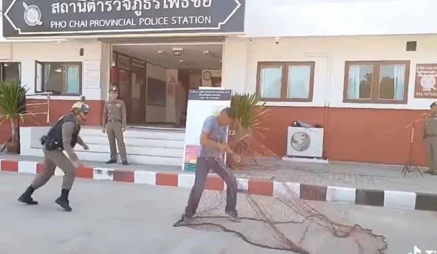 นอกจาก"ไม้ง่าม" ที่นำมาใช้ในการเข้าระงับเหตุคนคลุ้มคลั่งแล้ว "แหดักปลา" ก็เป็นอีกออฟชั่นหนึ่ง ที่ทางสถานีตำรวจภูธรโพธิ์ชัย นำมาเป็นอุปกรณ์ในการฝึกซ้อม เข้าระงับเหตุ