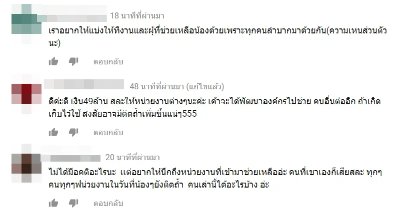 "เราอยากให้แบ่งให้ทีงานและผุ้ทึ่ช่วยเหลือน้องด้วยเพราะทุกคนลำบากมาด้วยกัน(ความเหนส่วนตัวนะ) "