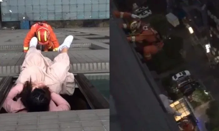 15ต.ค.61 สำนักข่าวหังโจวรื่อเป้า (杭州日报) รายงานว่า มีโทรศัพท์แจ้งความว่าพบเห็นหญิงสาวคนหนึ่งสวมชุดนอนนั่งอยู่ตรงหน้าต่างห้องชั้น 15 ของอาคารพักอาศัยแห่งหนึ่งในเมืองหางโจว ด้านนอกห้องดังกล่าวไม่มีระเบียงรองรับ ส่วนขาห้อยของหญิงสาวอยู่ด้านนอกตึก ประเดี๋ยวหัวเราะ ประเดี๋ยวร้องไห้ เหมือนกำลังคิดฆ่าตัวตาย หลังจากได้รับแจ้งเหตุ เจ้าหน้าที่กู้ภัยจึงรุดไปยังสถานที่ดังกล่าวทันที เมื่อเตรียมพร้อมอุปกรณ์ป้องกันเรียบร้อยแล้ว เจ้าหน้าที่ 1 นาย จึงปีนขึ้นไปหาเธอจากด้านล่าง และในขณะเดียวกันก็มีเจ้าหน้าที่อีก 1 นาย ปีนลงมาจากด้านบน โหนตัวลงมาใช้เข่า “ดัน” หญิงสาวกลับเข้าไปด้านในอาคารได้อย่างปลอดภัย ทุกคนจึงโล่งอกโล่งใจไปตามๆ กัน
