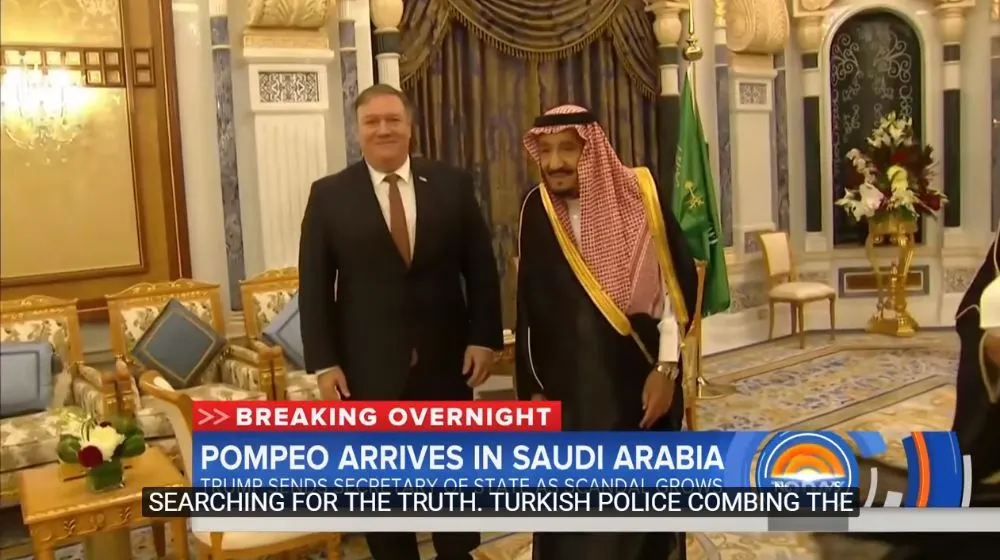 ทั้งนี้ทางรัฐบาลสหรัฐฯ ได้ทำการส่ง นายไมค์ ปอมเปโอ รัฐมนตรีต่างประเทศ ไปที่ซาอุดีอาระเบีย เพื่อรอเข้าเฝ้าสมเด็จพระราชาธิบดีซัลมานแล้ว หลังก่อนหน้านี้ทางราชวงศ์ซาอุดีอาระเบีย ยืนยันหนักแน่นว่าไม่ทราบเรื่องที่เกิดขึ้น โดยประธานาธิบดีโดนัลด์ ทรัมป์ ผู้นำสหรัฐอเมริกา แถลงว่า ได้พูดคุยกับกษัตริย์ซัลมานทางโทรศัพท์นาน 20 นาที ทรงปฏิเสธอย่างหนักแน่นว่าไม่ทรงทราบข้อมูลเกี่ยวกับเรื่องนายคาช็อกกีเลย
