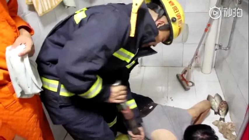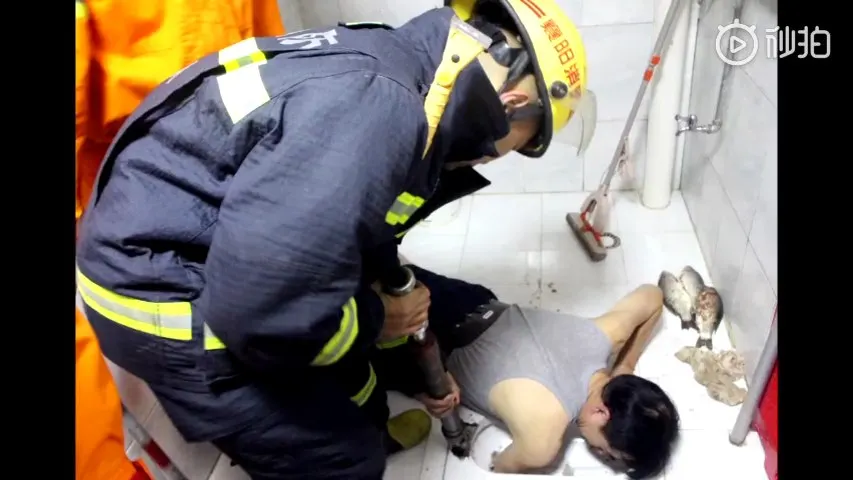 ชายหนุ่มไม่รอช้า ล้วงแขนเข้าไปใส่โถส้วมหมายจะคว้าปลาไว้ไม่ให้หนี ผลปรากฏว่าปลาก็จับไม่ทัน แขนก็ติดอยู่ในโถส้วม ดึงอย่างไรก็ดึงไม่ออก ร้อนถึงหน่วยกู้ภัยต้องเข้ามาช่วยทุบโถส้วมเพื่อดึงแขนเขาออกมา