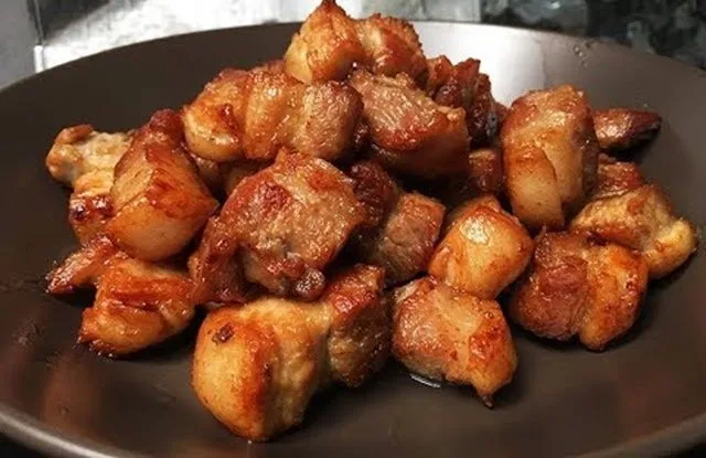 ตัดหนังออก แล้วตั้งกระทำไฟกลางเพราะหมูจะได้สุกทั่ว ไม่ไหม้เสียก่อน เอาหมู3ชั้นลงกระทะ ย่างให้ข้างนึงสุกก่อนแล้วกลับอีกด้าน กลับไปกลับมา รีดน้ำมันออก พอนำมันออกเกือบหมดแล้วใช้กรรไกรตัดเป็นชิ้น แล้วเทน้ำมันออก เหลือไว้นิดนึงแล้วใส่น้ำปลาประมาณ 2 ช้อน เดี๋ยวจะเค็ม..คลุกให้เข้าเนื้อก็เป็นอันเสร็จ