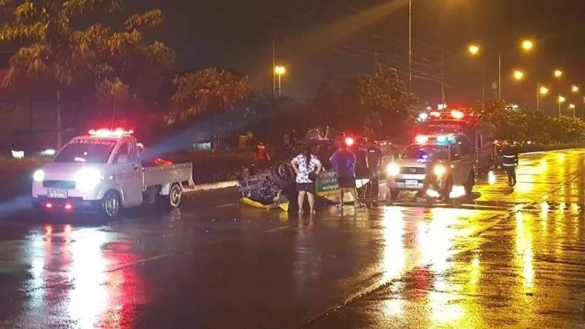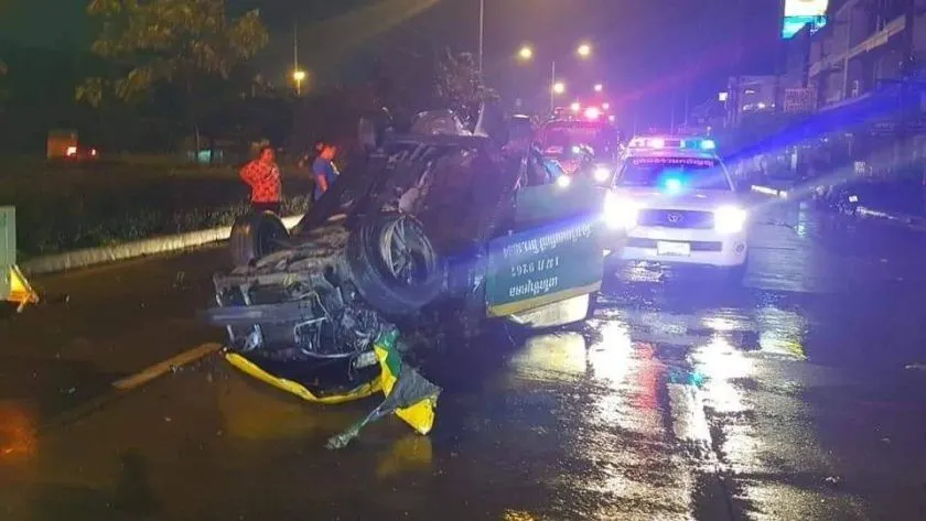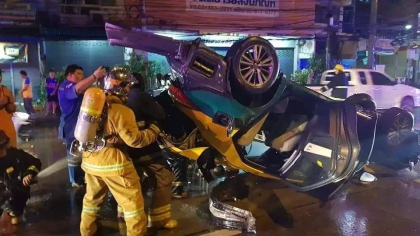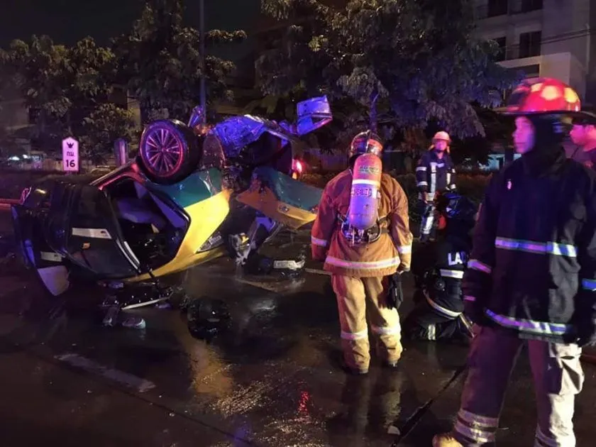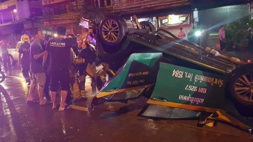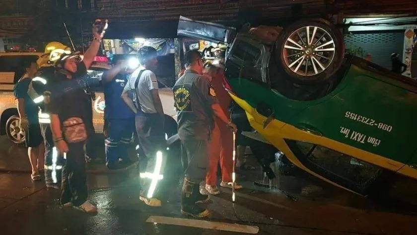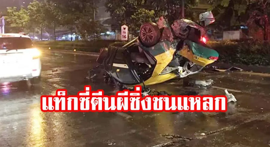 โชเฟอร์แท็กซี่ซิ่งฝ่าสายฝน เฉี่ยวคนแก่วัย 70 ปีข้ามถนนแล้วรถเสียหลักพุ่งชนอาคารพาณิชย์ผลิกคว่ำทำให้มีผู้บาดเจ็บ 2 ราย ผู้โดยสารเสียชีวิต 1 รายย่านพระประแดง