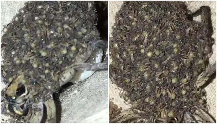 ดูกันชัดๆ ลูกแมงมุมหมาป่านับร้อยตัวกำลังเกาะยั้วเยี้ยเต็มหลังแม่แมงมุม ดูแล้วชวนขนลุกสุดๆ (มีคลิป)