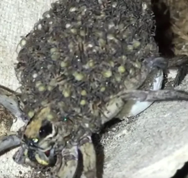 ในคลิปจะเห็นว่ามีเหล่าลูกๆแมงมุมหมาป่านับร้อยตัวที่เพิ่งฟักตัวออกจากไข่ กำลังเกาะอยู่บนหลังแม่ของมัน แน่นอนว่ามันเป็นอะไรที่น่าตื่นเต้นสำหรับคนที่ชื่นชอบสัตว์แปลกๆเหล่านี้ แต่ก็สำหรับคนที่ไม่ชอบมันก็เป็นอะไรที่ชวนขนลุกแบบสุดๆ