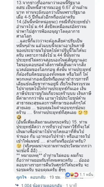 มีอยู่คอมเมนต์หนึ่งซึ่งผู้กดไลค์กว่า11,000คนโดยผู้ใช้เฟซบุ๊กรายหนึ่งได้คอมเมนต์ถามพล.อ.ประยุทธ์หรือ“ตู่ดิจิทัล”ว่าอะไรเชิญไปอ่านกันเอาเองก็แล้วกัน…..