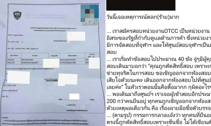... พอเดินมาถึงศูนย์ฯ เราเจอผู้เข้าสอบอีกประมาณ 200 กว่าคนยืนอยู่ ทุกคนถูกเชิญออกจากห้องสอบด้วยเหตุผลเดียวกัน คือ เรื่องลายมือชื่อตัวบรรจง!