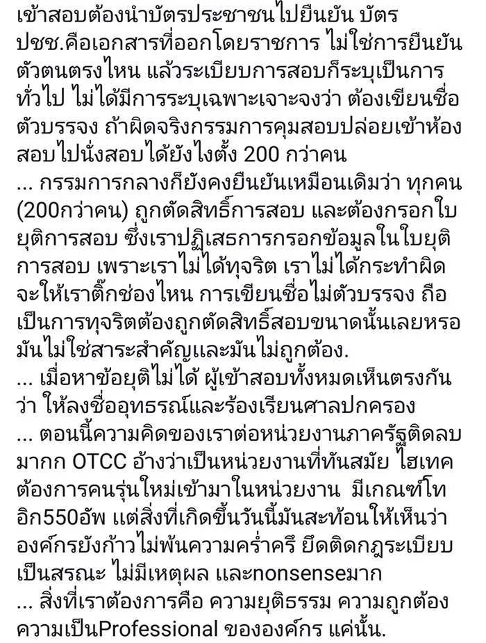 ... เราถามว่า การเขียนตัวบรรจงคือเขียนยังไง กรรมการกลางบอกว่า คือการเขียนให้อ่านออก (แล้วตามรูปอ่านไม่ออกตรงไหนหรอ?) อีกอย่างการเข้าสอบต้องนำบัตรประชาชนไปยืนยัน บัตรปชช.คือเอกสารที่ออกโดยราชการ ไม่ใช่การยืนยันตัวตนตรงไหน แล้วระเบียบการสอบก็ระบุเป็นการทั่วไป ไม่ได้มีการระบุเฉพาะเจาะจงว่า ต้องเขียนชื่อตัวบรรจง ถ้าผิดจริงกรรมการคุมสอบปล่อยเข้าห้องสอบไปนั่งสอบได้ยังไงตั้ง 200 กว่าคน