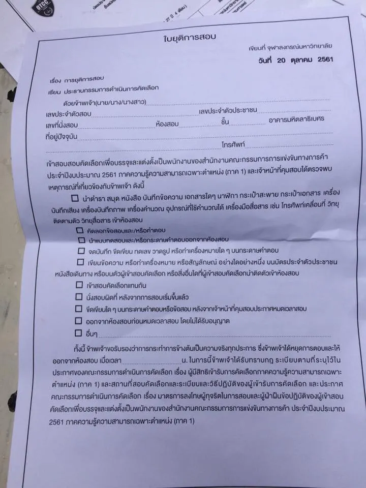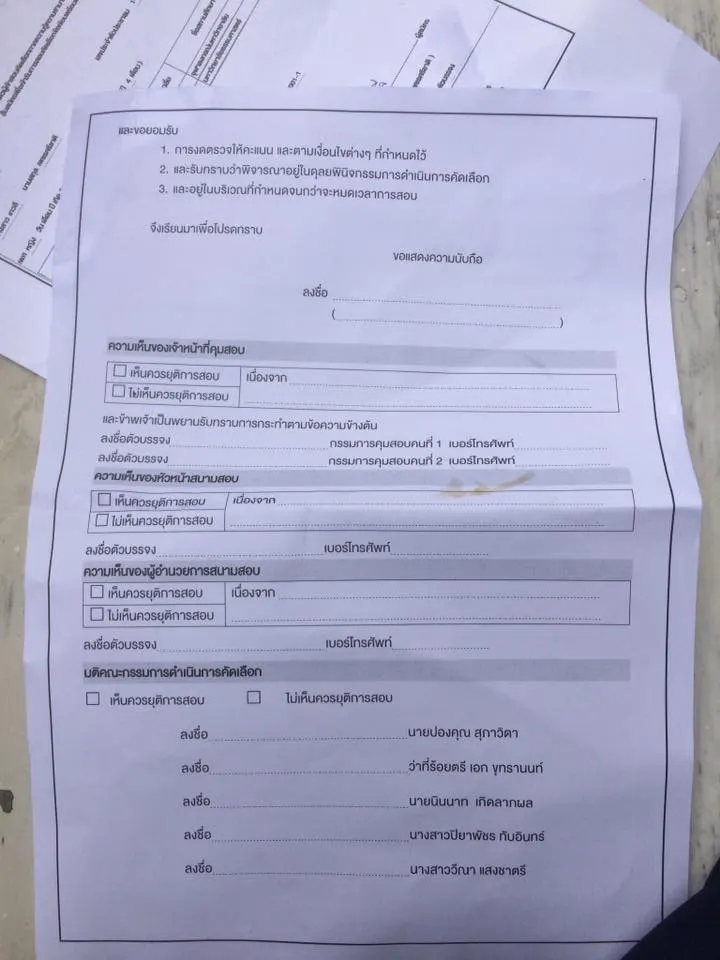 ... (ตามรูป) กรรมการกลางเเจ้งว่า ทุกคนที่ยืนอยู่ตรงนี้ถูกตัดสิทธิ์สอบเพราะเซ็นชื่อ ไม่ได้เขียนตัวบรรจง เพราะการเซ็นชื่อไม่ใช่การยืนยันตัวตน (เงิบบ!)