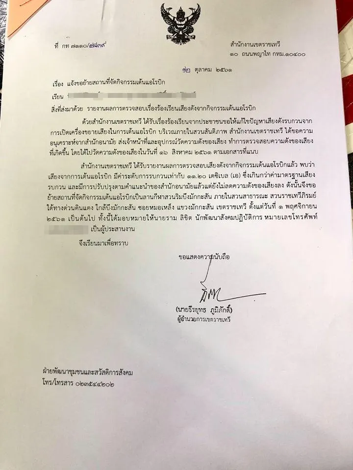 ผู้โพสต์ระบุว่า มีนายแพทย์ท่านหนึ่งที่อาศัยใกล้เคียงกับสวนสาธารณะแห่งนี้ ทำหนังสือร้องเรียนไปยังสำนักงานเขต ว่าการเต้นแอโรบิกในช่วงเวลา 18.00 น. จนถึง 19.00 น. ณ สวนสันติภาพ ส่งเสียงดังรบกวนเวลานอนหน่วยงานที่เกี่ยวข้องจึงทำการวัดความดังของระดับเสียง พบว่ามีค่าระดับการรบกวนเท่ากับ 11.20 เดซิเบล (เอ) ล่าสุดทางเขตราชเทวี จึงมีหนังสือมาที่สวนสาธารณะ ให้ย้ายพื้นที่จัดกิจกรรมแอโรบิกไปอยู่ในสวนริมบึงมักกะสันทดแทน ซึ่งพื้นที่ดังกล่าวห่างไกลจากพื้นที่เดิม ทำให้ประชาชนจำนวนมากเกิดความยากลำบากในการเดินทาง