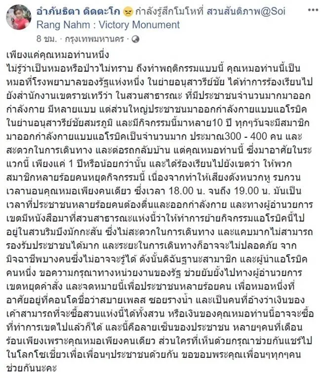 ผู้ใช้เฟซบุ๊กรายหนึ่งได้โพสต์ข้อความระบุว่า ถูกคุณหมอที่โรงพยาบาลของรัฐแห่งหนึ่ง ย่านอนุสาวรีย์ชัยฯ ไปร้องเรียนสำนักงานเขตราชเทวีว่า ในสวนสาธารณะสันติภาพ มีกลุ่มสมาชิกเต้นแอโรบิก ส่งเสียงดังรบกวนเวลานอนในเวลา 18.00 น. เจ้าหน้าที่ทางสำนักงานเขตออกหนังสือให้กลุ่ม สมาชิกแอโรบิกย้ายสถานที่ออกกำลังกายไปอยู่ที่บริเวณสวนริมบึงมักกะสัน โดยผู้โพสต์ได้มีการระบุว่า