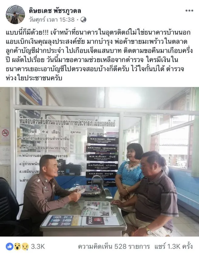 เมื่อวันที่ 21 ต.ค. 61 จากกรณีมีผู้ใช้เฟสบุ๊กชื่อ ดิษยเดช พัชรภูวดล ซึ่งเป็นเจ้าหน้าที่ตำรวจท่านหนึ่ง ได้โพสต์ข้อความเตือนภัย เมื่อวันที่ 19 ต.ค. ที่ผ่านมาถึงกรณี เจ้าหน้าที่ธนาคารใน จ.อุตรดิตถ์ แอบเบิกเงินคุณลุงประสงค์ชัย มากบำรุง พ่อค้าขายมะพร้าวในตลาด ลูกค้าบัญชีฝากประจำ ไปเกือบ 7 แสนบาท ติดตามขอคืนมาเกือบครึ่งปี ยังไม่เป็นผลจึงต้องมาขอความช่วยเหลือจากตำรวจนั้น