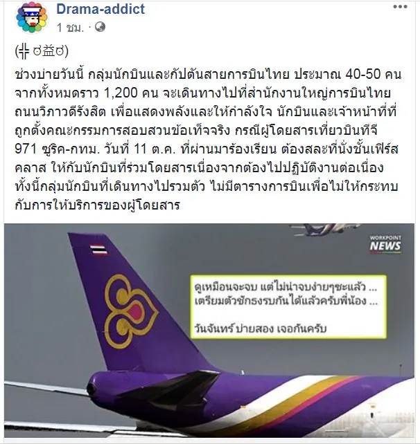 ช่วงบ่ายวันนี้ กลุ่มนักบินและกัปตันสายการบินไทย ประมาณ 40-50 คน จากทั้งหมดราว 1,200 คน จะเดินทางไปที่สำนักงานใหญ่การบินไทย ถนนวิภาวดีรังสิต เพื่อแสดงพลังและให้กำลังใจ นักบินและเจ้าหน้าที่ที่ถูกตั้งคณะกรรมการสอบสวนข้อเท็จจริง กรณีผู้โดยสารเที่ยวบินทีจี 971 ซูริค-กทม. วันที่ 11 ต.ค. ที่ผ่านมาร้องเรียน ต้องสละที่นั่งชั้นเฟิร์สคลาส ให้กับนักบินที่ร่วมโดยสารเนื่องจากต้องไปปฏิบัติงานต่อเนื่อง ทั้งนี้กลุ่มนักบินที่เดินทางไปรวมตัว ไม่มีตารางการบินเพื่อไม่ให้กระทบกับการให้บริการของผู้โดยสาร