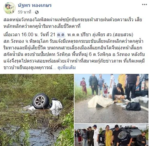 เกิดเหตุการณ์อันน่าสลดเมื่อหนุ่มวังทองไลฟ์สดผ่านเฟซบุ๊กขับกระบะฝ่าสายฝนด้วยความเร็ว เสียหลักพลิกคว่ำตกคูน้ำริมทางเสียชีวิตคาที่ โดยเจ้าของเฟซบุ๊ค นัฐพร ทองเกษร ได้โพสต์ระบุว่า