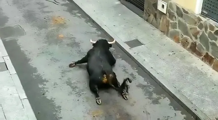 สะเทือนใจ!! กระทิงตัวใหญ่ลากตัวเองไปตามถนน หลังขาหลังหักในช่วงเทศกาลสู้วัวกระทิงที่สเปน (มีคลิป)